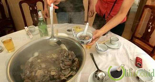 [lihat.co.id] - Dianggap sebagai salah satu masakan menjijikkan, bagaimana cara membuatnya? Gampangnya kamu cari daging bagian paha sapi muda lalu kamu rebus sangat lama. Seakan kurang, campurkan dengan bagian otak sapi muda. Setelah melunak, saring ke dalam cetakan sampai membentuk lembut ala jeli yang bisa juga kamu bekukan sebelum kamu siapkan irisan telur saat mau memakannya.