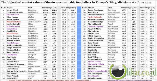 5 Klub Sepakbola dengan Skuad termahal di Dunia - Baru-baru ini Sportingintelligence telah merilis daftar 60 besar pesepakbola yang memiliki nilai jual termahal di dunia. Nilai jual tersebut dihitung berdasarkan usia, posisi, kondisi kontrak, pengalaman internasional, klub tempat mereka bermain, serta performa mereka sepanjang musim.