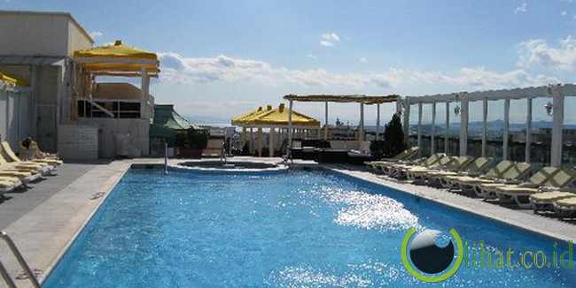 [lihat.co.id] - Kolam renang di atap hotel di pusat Athena memiliki 360 derajat pemandangan kota kuno. Pemandangan ini termasuk Benteng Acropolis dan pemandangan luas dan serasa dekat dengan  Parthenon, kuil para dewa Yunani. Anda juga dapat melihat jejeran kafe, toko-toko, serta jalan Plaka yang berliku.
