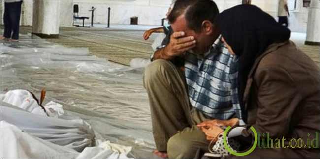 [lihat.co.id] - Warga Suriah mengidentifikasi mayat, setelah serangan gas beracun yang diduga ditembakkan tentara Suriah. Sebagian besar adalah mayat anak-anak. Gambar diambil di Arbeen, Damaskus, pada 21 Agustus 2013.