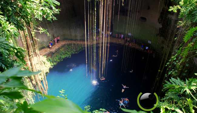 [lihat.co.id] - Lubang runtuhan Ik-Kil Cenote terletak di dekat kuil Maya Chichen Itza di Semenanjung Yucatan Meksiko. Cenote berarti “alam yang baik”. Lubang ini terisi oleh air dengan ketinggian 26 meter di bawah permukaan tanah dengan kedalaman keseluruhan 60 meter.