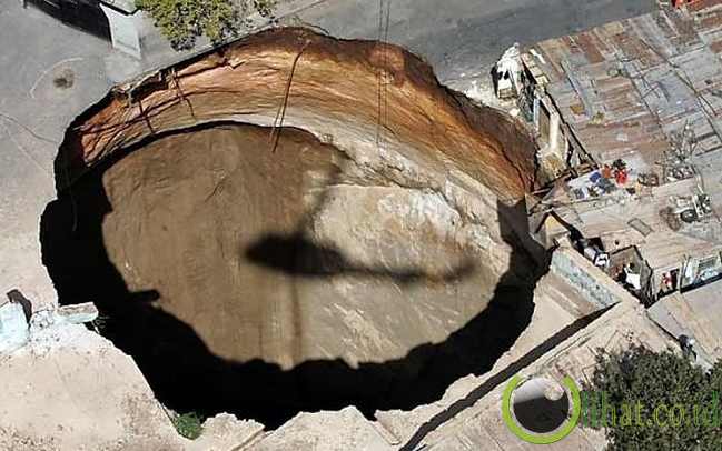 [lihat.co.id] - Lubang runtuhan yang muncul di daerah Mulberry, Florida pada tahun 1994 ini memiliki kedalaman 56 meter. Lubang alami ini terletak di tempat pembuangan limbah perusahaan tambang IMC Agrico.