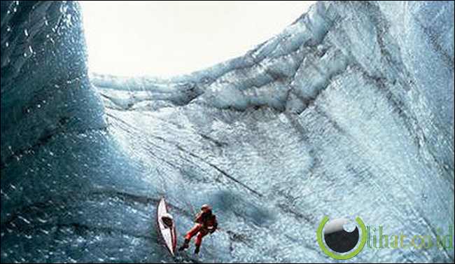 [lihat.co.id] - Lubang runtuhan ini terletak di Islandia, dengan kedalaman 45 meter. Foto ini adalah Mick Coyne, seorang petualang dan pemain kayak yang sedang menuruni lubang runtuhan menuju sungai Jokulsa, sungai terpanjang kedua di Islandia. Lubang runtuhan ini terjadi akibat fenomena alam uap panas bumi.