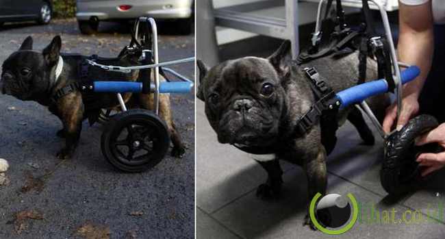 [lihat.co.id] - Marco van den Boom adalah seorang insinyur untuk pengobatan hewan yang memasangkan kaki beroda pada seekor anjing bulldog prancis.