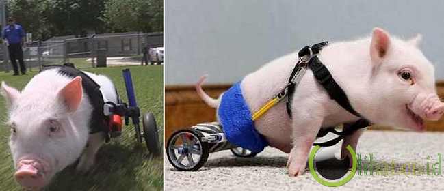 [lihat.co.id] - Chris P. Bacon, seekor babi dilahirkan cacat di Rumah Sakit Eastside Veterinary, Clermont, Florida. Babi malang tersebut dilahirkan cacat dimana kaki belakangnya lumpuh.